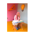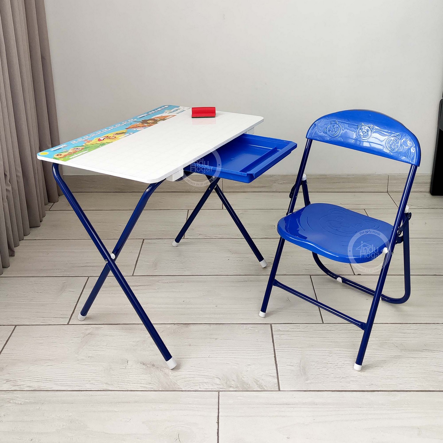 Practico escritorio con silla plegable para niños con superficie en acrílico para que tus nenes escriban o dibujen en el tablero. incluye marcador borrable y borrador.