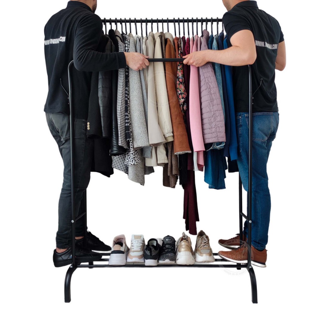 Exhibidor para uso industrial o pesado, multifuncional 3 en 1 con doble espacio para exhibir o almacenar prendas y zapatos. Diseñado para ser desarmable, resistente y duradero, ya que su estructura es en tubo de acero con pintura electro estática negro mate.