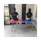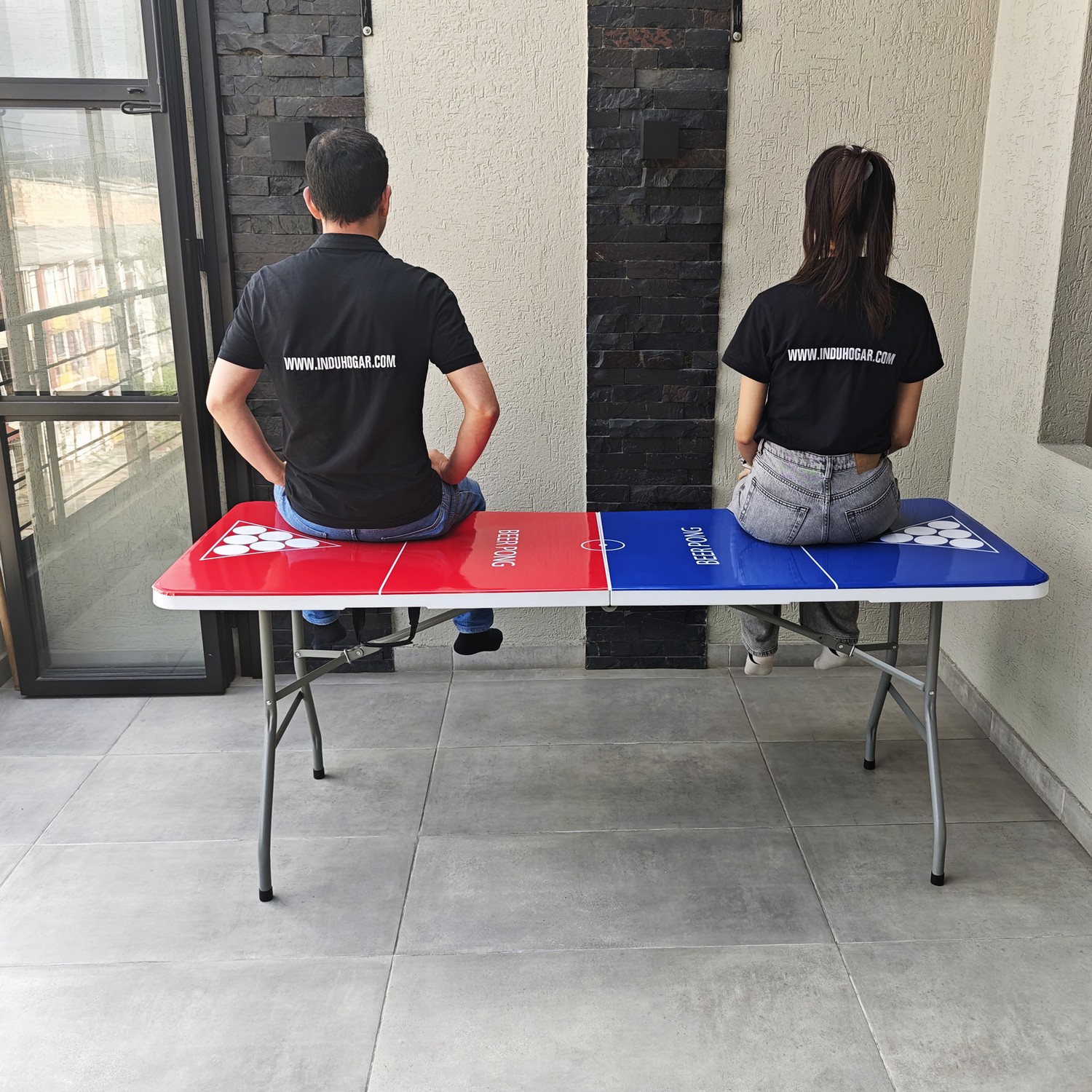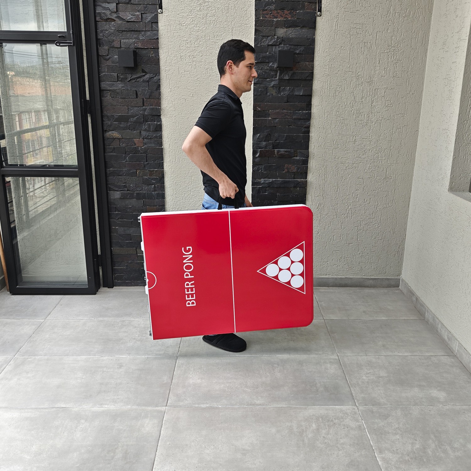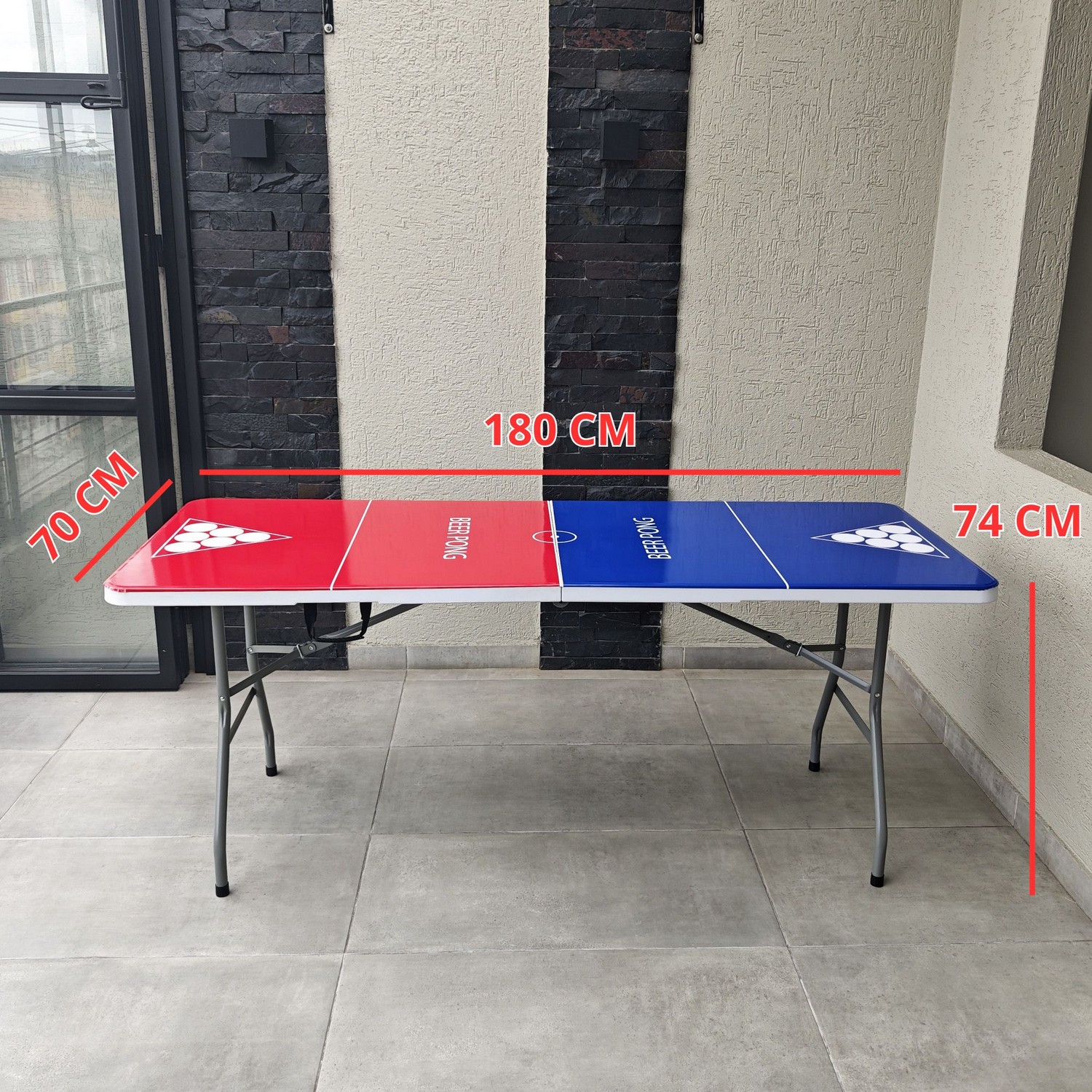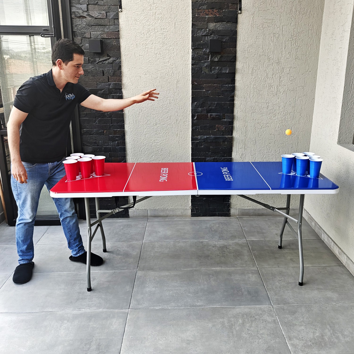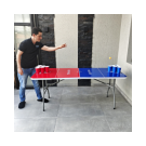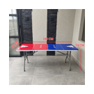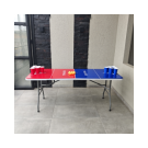 Mesa plegable para jugar beer pong + vasos + pinpones con estructura en acero que soporta hasta 150kg distribuidos en su superficie. Cuenta con dos tipos de seguro que te dan la tranquilidad de tener una mesa firme y estable; el primer seguro es en acero y se activa automáticamente cuando se abre la mesa y el segundo seguro son dos argollas de acero que se deslizan cuando se voltea la mesa. Es multifuncional ya que la puedes utilizar en banquetes, mesa para el computador, auxiliar para el hogar, eventos recreativos al aire libre etc. También es de fácil almacenamiento y traslado ya que se pliega en forma de maletín y cuenta con manija para cargarla.