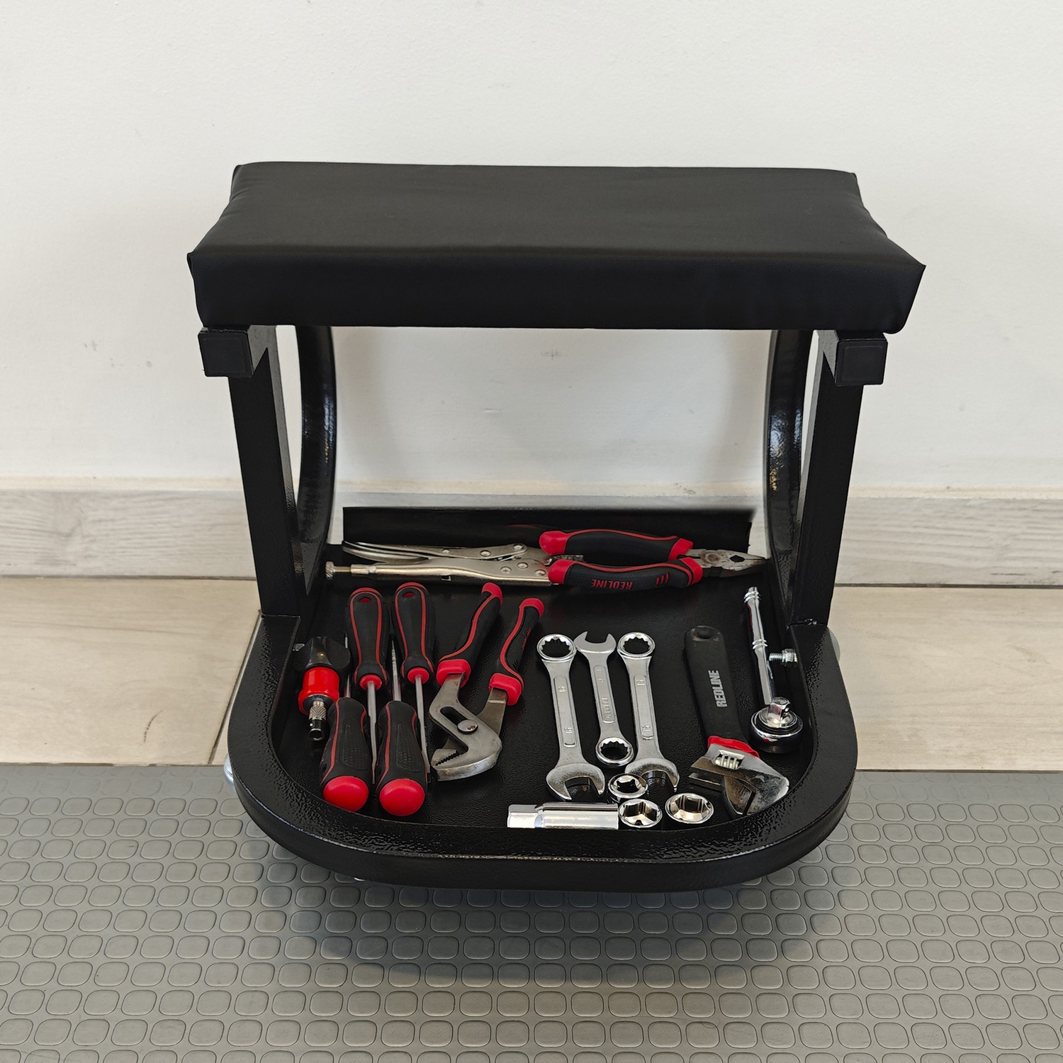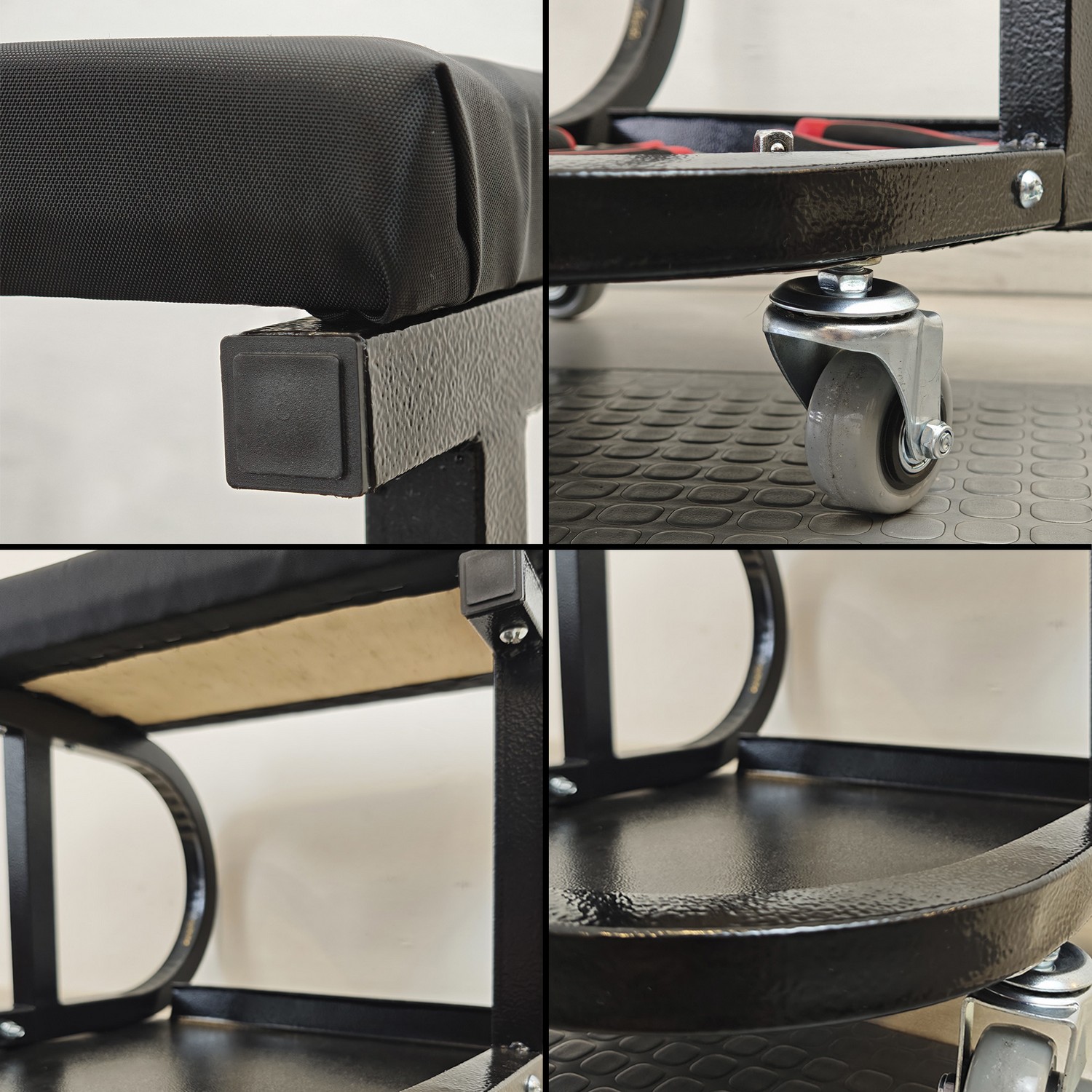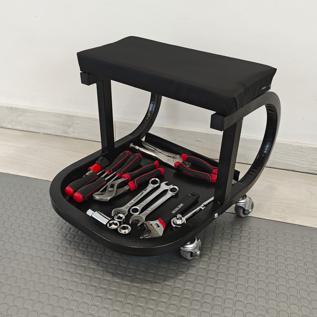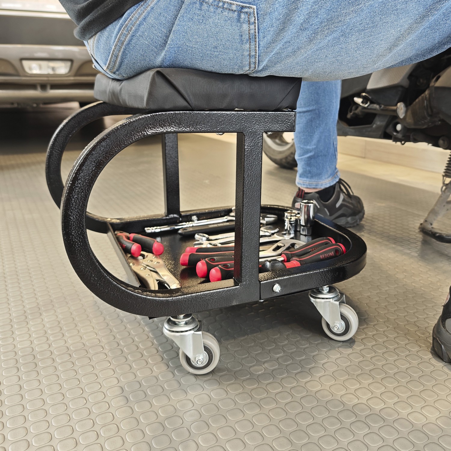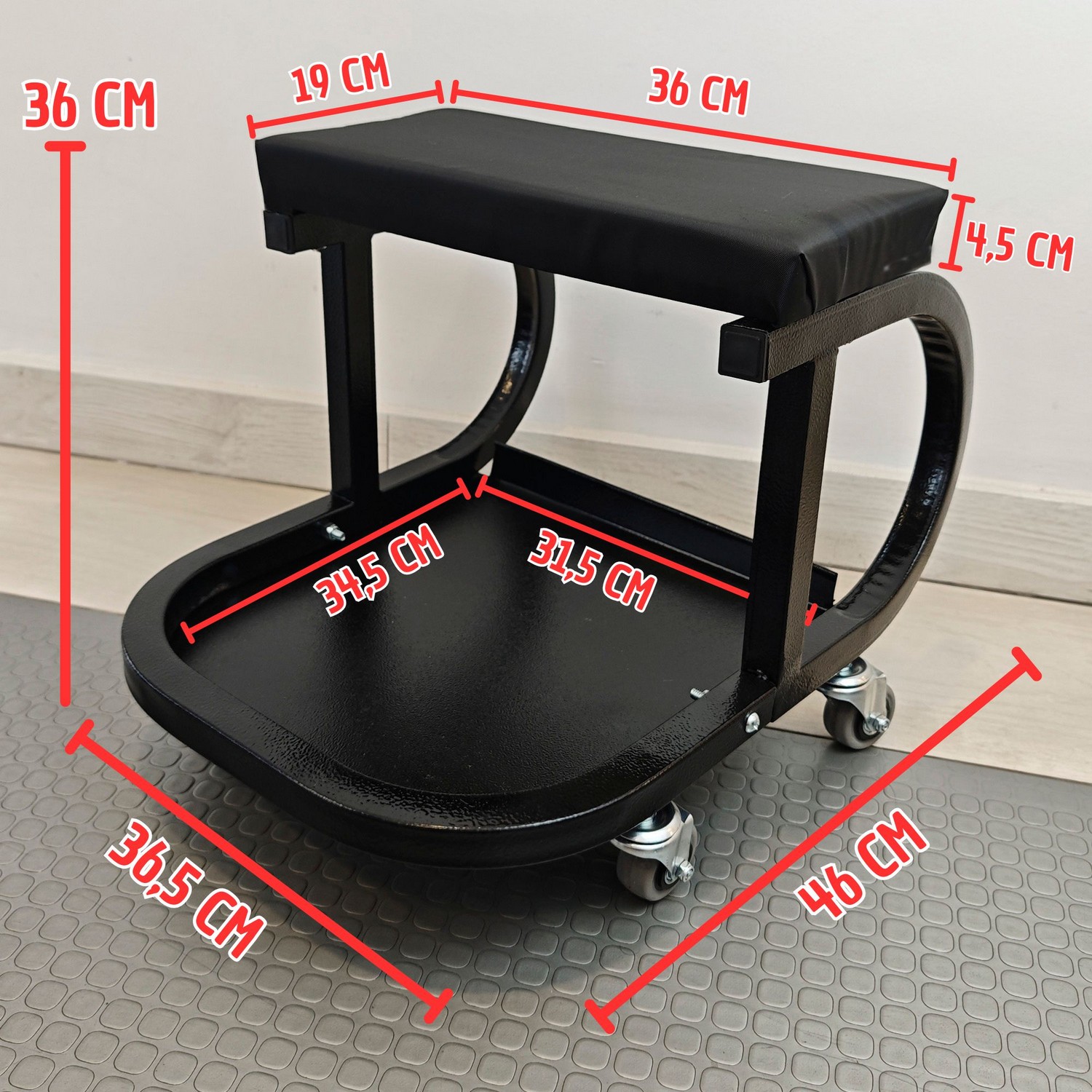 ¿Estás cansado del desorden y de perder tiempo buscando la herramienta? No debes preocuparte más por eso, es hora de transformar tu espacio y optimizar tu tiempo de trabajo con nuestra silla para mecánico, que cambiará tu día a día. Gracias a que cuenta con una robusta bandeja inferior, te ayudará a mantener tus herramientas esenciales organizadas, al alcance de la mano. Olvídate de los bancos estáticos, gracias a sus ruedas con balineras de alta calidad, podrás mover tu estación de trabajo a donde la necesites, sin esfuerzo. Está diseñado para resistir el uso rudo, ya que es totalmente metálico con pintura electroestática y tubo cuadrado calibre 18. El asiento es en espuma rosada de 3 cm de espesor y está tapizado con lona antifluidos.