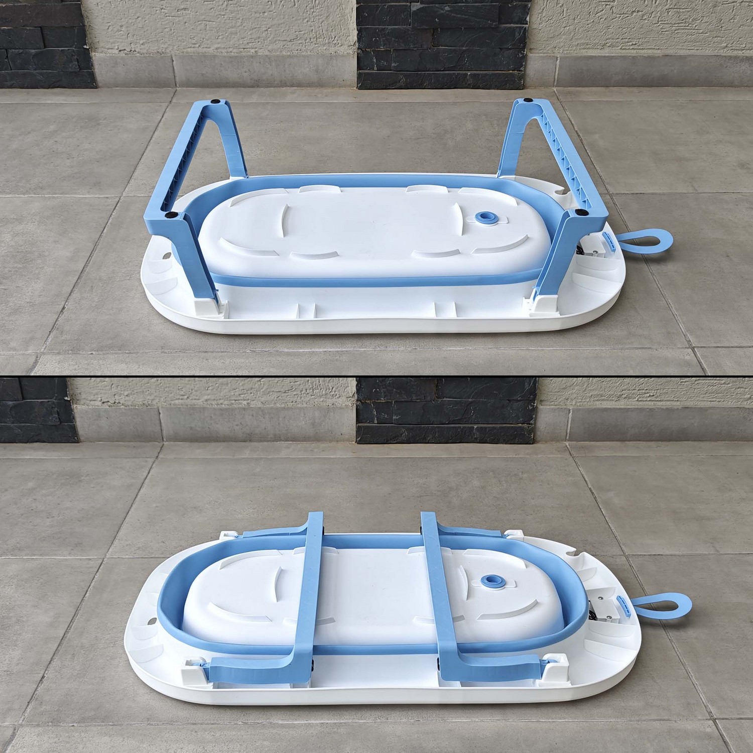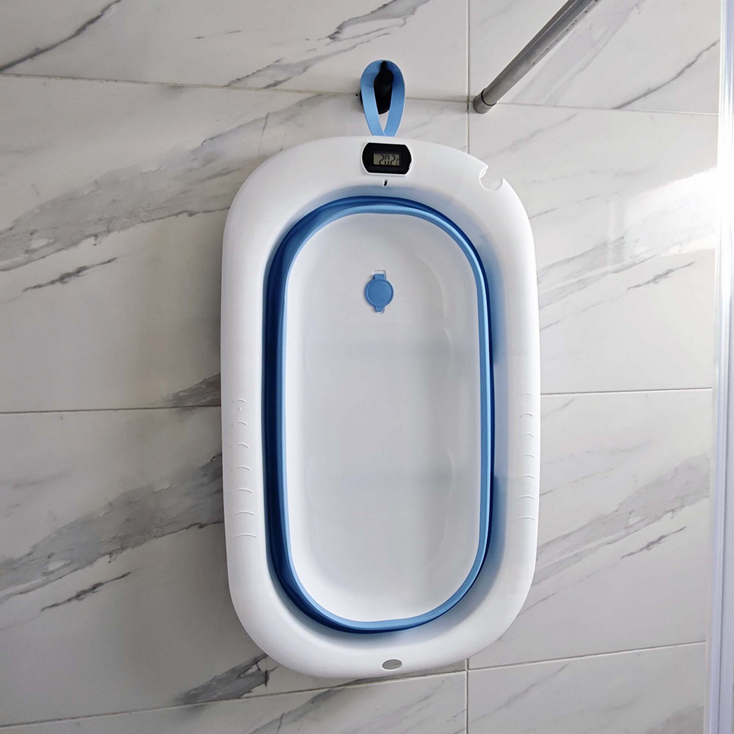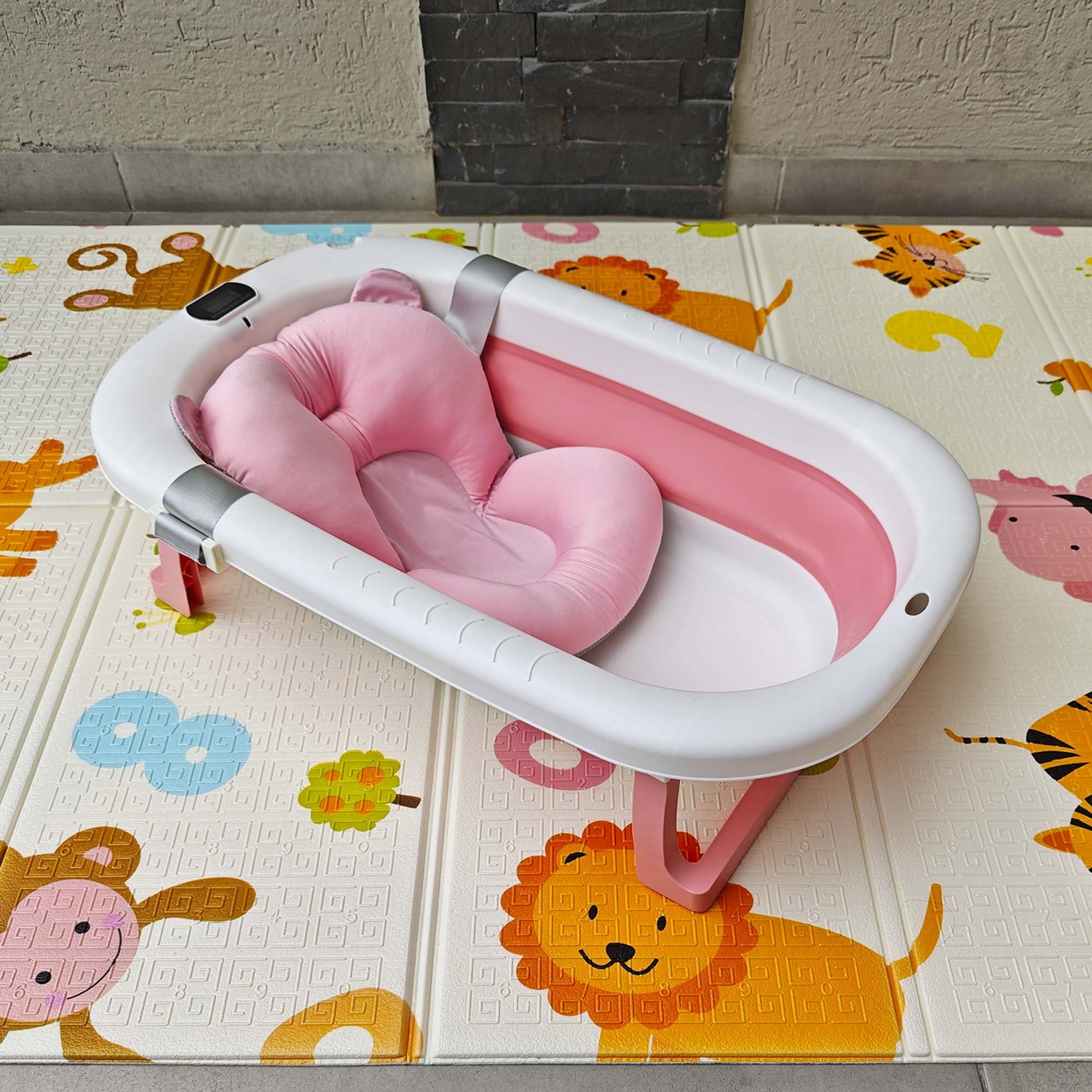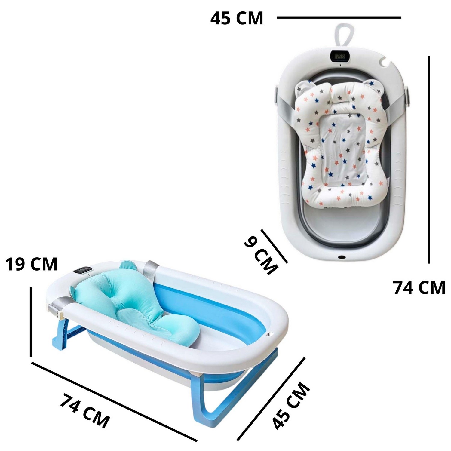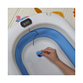 Práctica, segura y cómoda bañera con termómetro mas cojín apta para viajes ya que la puedes guardar de manera fácil, gracias a que es completamente plegable.