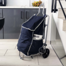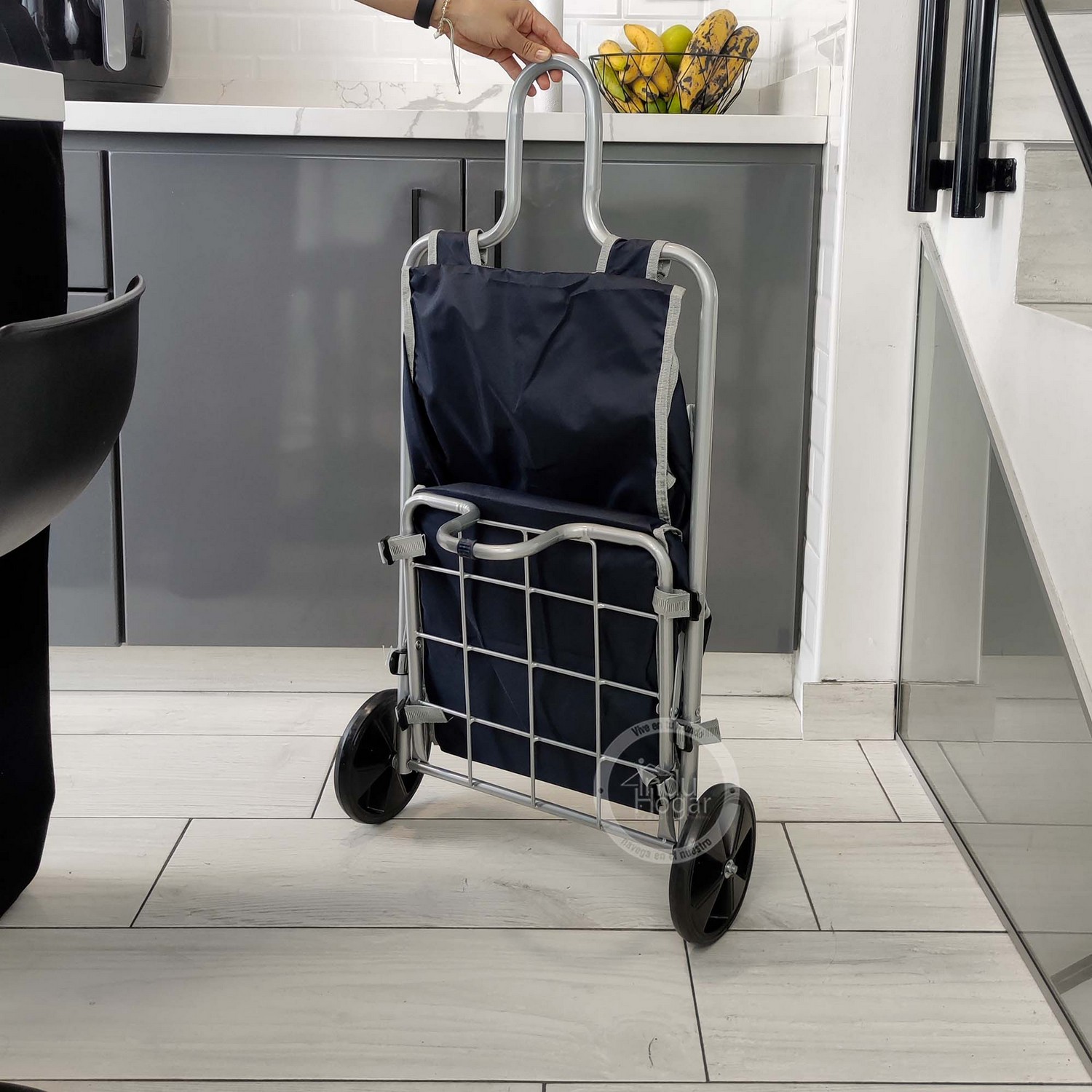 Carro de mercado plegable con estructura de acero, tubo redondo y alambrón en la base con pintura electroestatica, maleta en lona resistente que cuenta con un bolsillo lateral y otro bolsillo en la parte de atrás con cremallera.