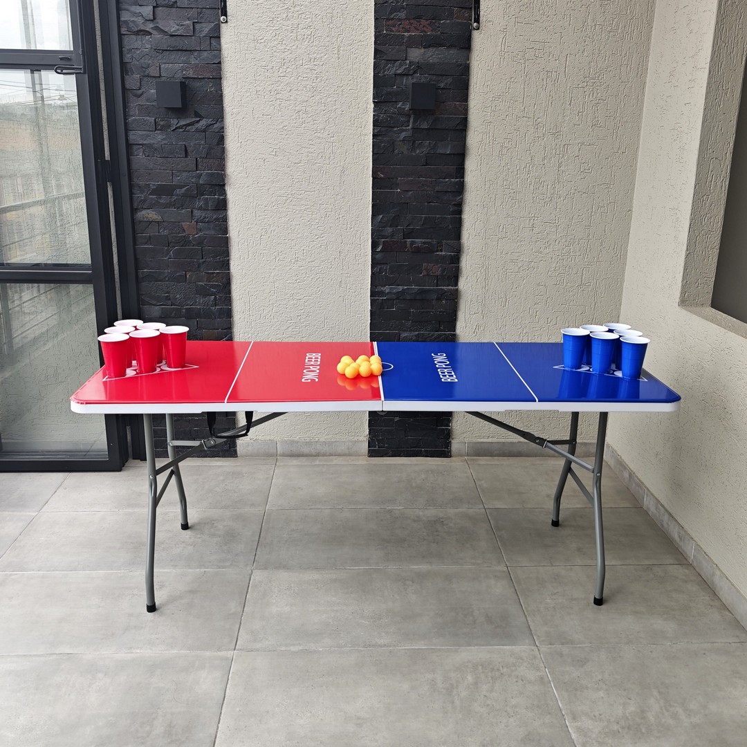 Mesa plegable para jugar beer pong + vasos + pinpones con estructura en acero que soporta hasta 150kg distribuidos en su superficie. Cuenta con dos tipos de seguro que te dan la tranquilidad de tener una mesa firme y estable; el primer seguro es en acero y se activa automáticamente cuando se abre la mesa y el segundo seguro son dos argollas de acero que se deslizan cuando se voltea la mesa. Es multifuncional ya que la puedes utilizar en banquetes, mesa para el computador, auxiliar para el hogar, eventos recreativos al aire libre etc. También es de fácil almacenamiento y traslado ya que se pliega en forma de maletín y cuenta con manija para cargarla.
