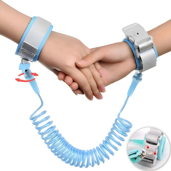 Cuenta con 2 metros de largo y giro de 360° que le permite al niño moverse libremente sin perderlo de vista, las pulseras tienen tela antitranspirante, son acolchonadas y confortables.
