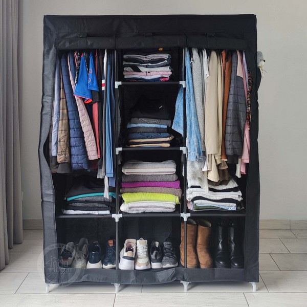 Práctico closet doble, está diseñado especialmente para ser resistente y al mismo tiempo, proteger tu ropa del polvo y la humedad, ya que su estructura es en tubo metálico y a diferencia de otros closets del mercado, sus entrepaños están mejorados, son fabricados en tela tifón gruesa que no cede y soporta más peso. Por otra parte, el forro está fabricado en tela oxford 210D, tela especialmente diseñada para proteger tu ropa del polvo, pelos de mascotas, humedad y demás factores que afectan nuestra ropa. Nuestro closet cuenta con 8 entrepaños y doble espacio para colgar la ropa, es liviano, portable y totalmente desarmable.