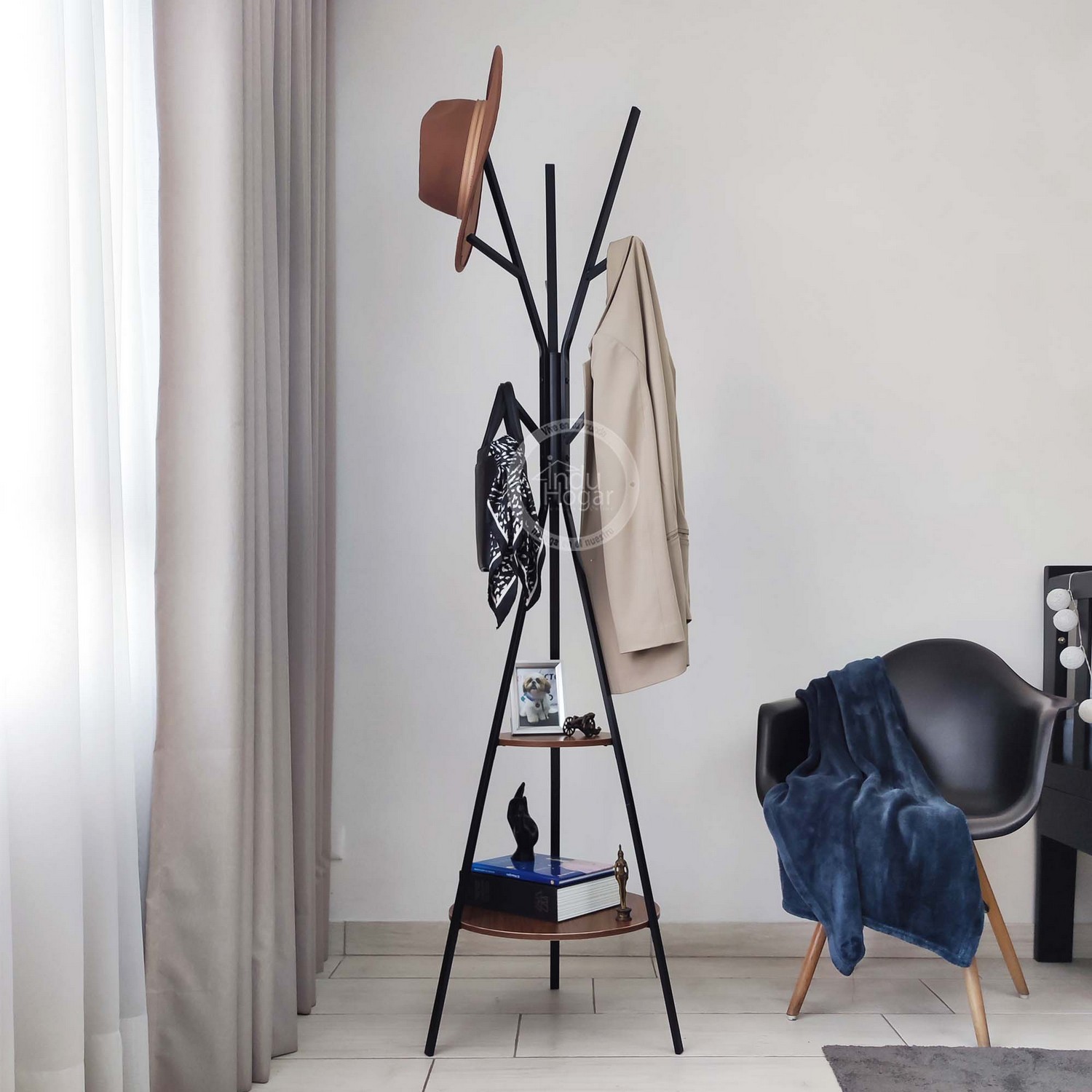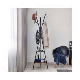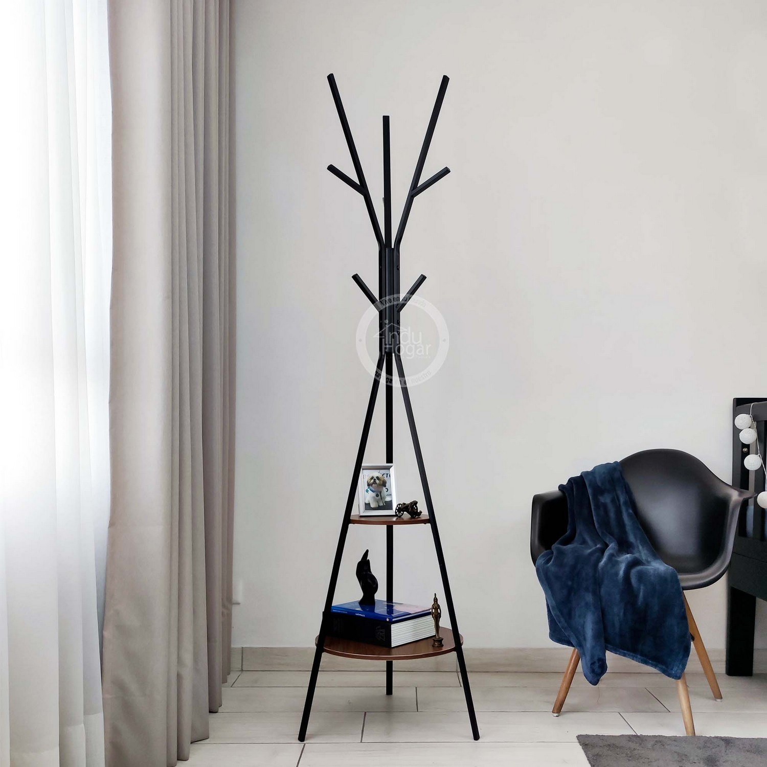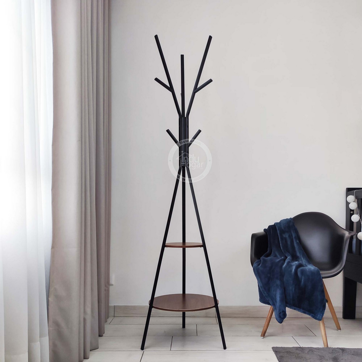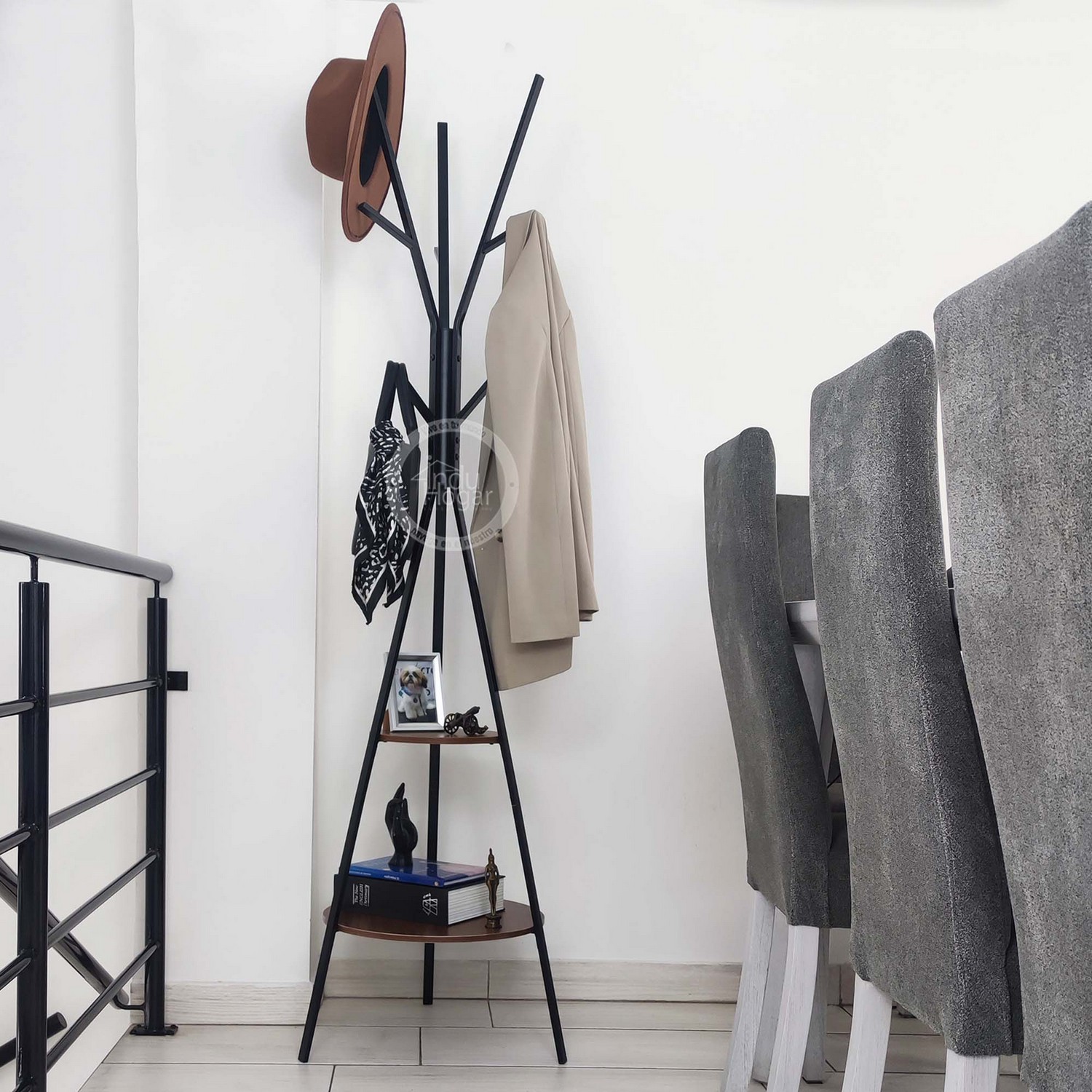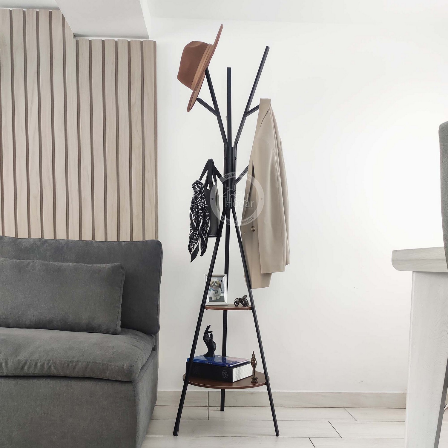 Hermoso perchero con estructura en tubo con pintura electro estatica negro mate y entrepaños de madera. Capacidad de 9 ganchos mas 2 entrepaños para organizar tus prendas en el hogar u oficina. Diseñado para ser liviano, resistente y desarmable.