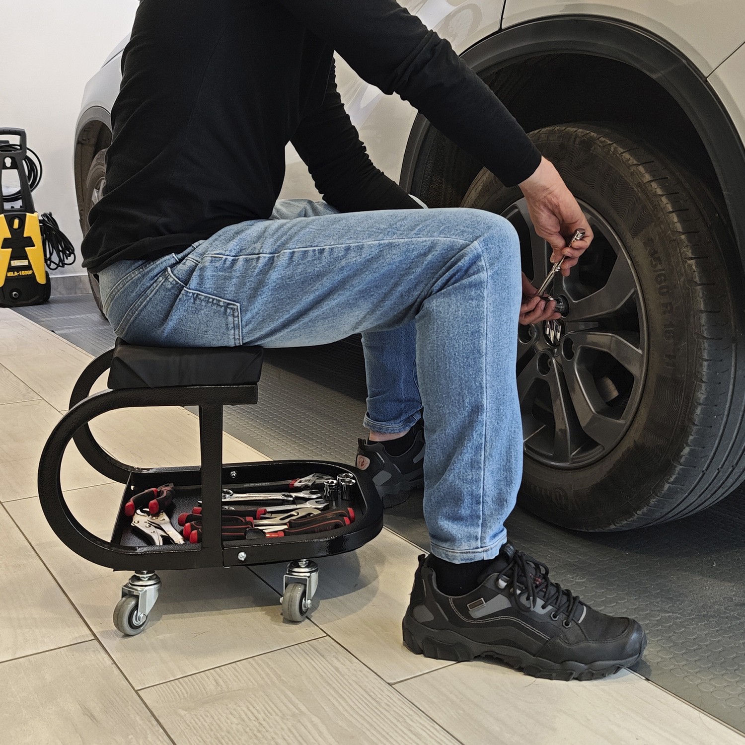 ¿Estás cansado del desorden y de perder tiempo buscando la herramienta? No debes preocuparte más por eso, es hora de transformar tu espacio y optimizar tu tiempo de trabajo con nuestra silla para mecánico, que cambiará tu día a día. Gracias a que cuenta con una robusta bandeja inferior, te ayudará a mantener tus herramientas esenciales organizadas, al alcance de la mano. Olvídate de los bancos estáticos, gracias a sus ruedas con balineras de alta calidad, podrás mover tu estación de trabajo a donde la necesites, sin esfuerzo. Está diseñado para resistir el uso rudo, ya que es totalmente metálico con pintura electroestática y tubo cuadrado calibre 18. El asiento es en espuma rosada de 3 cm de espesor y está tapizado con lona antifluidos.