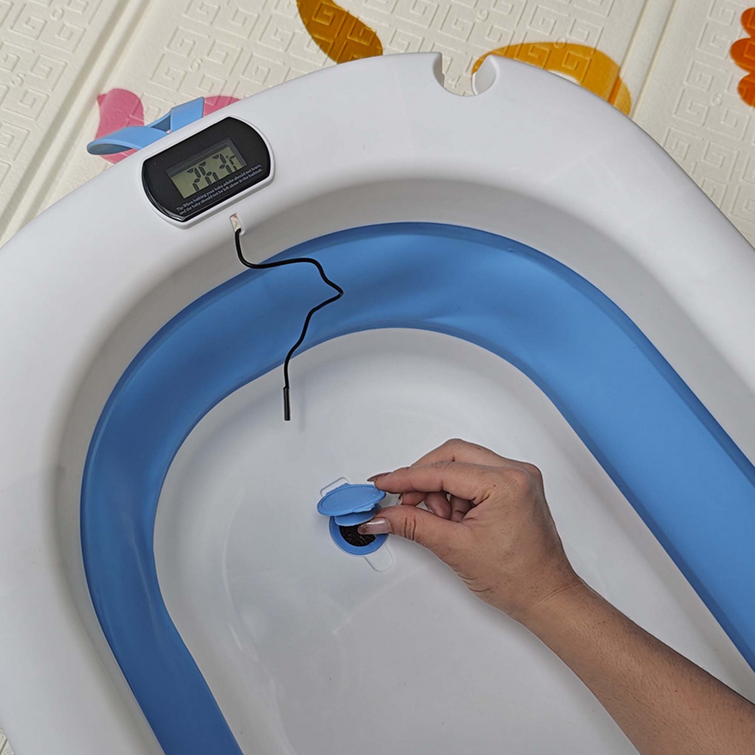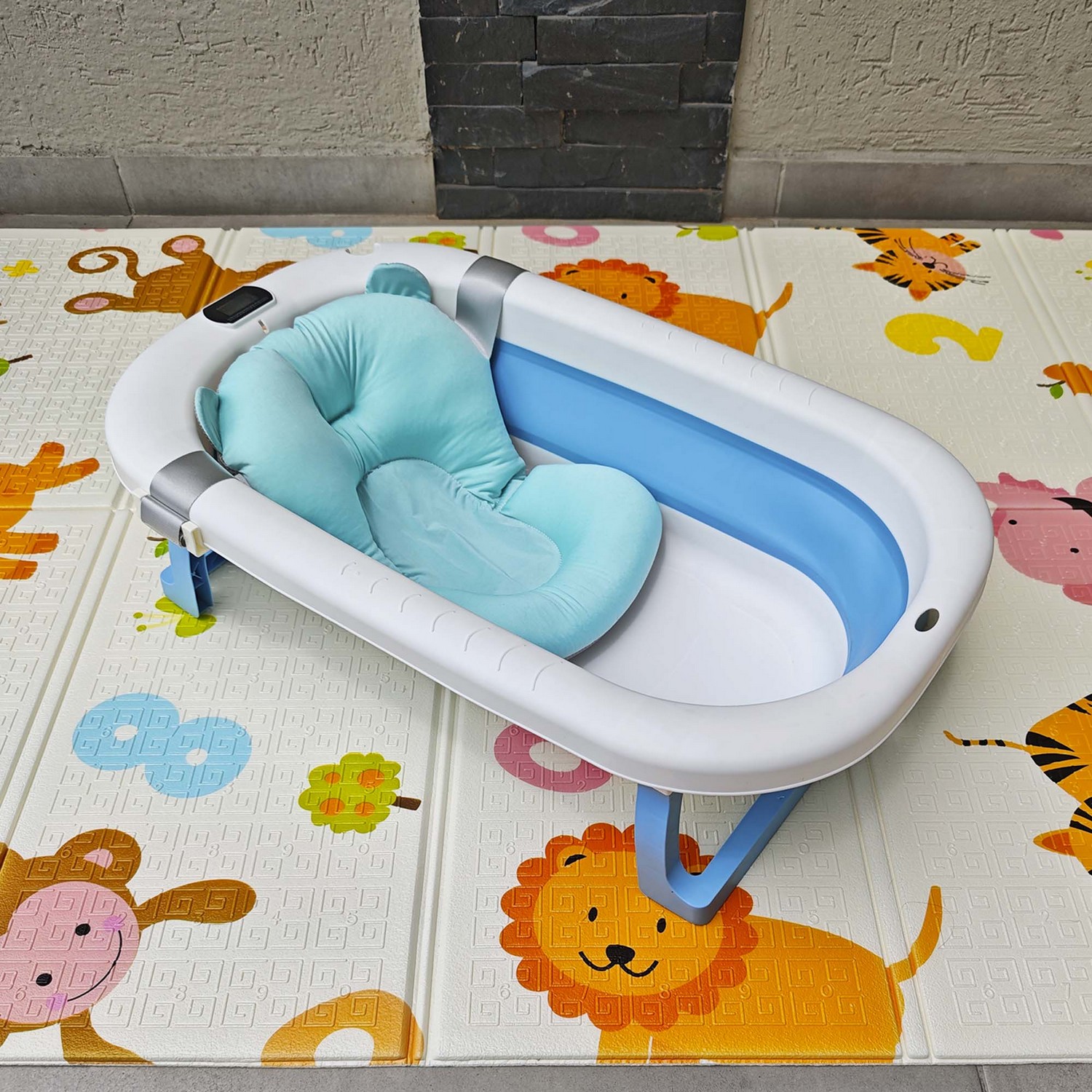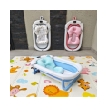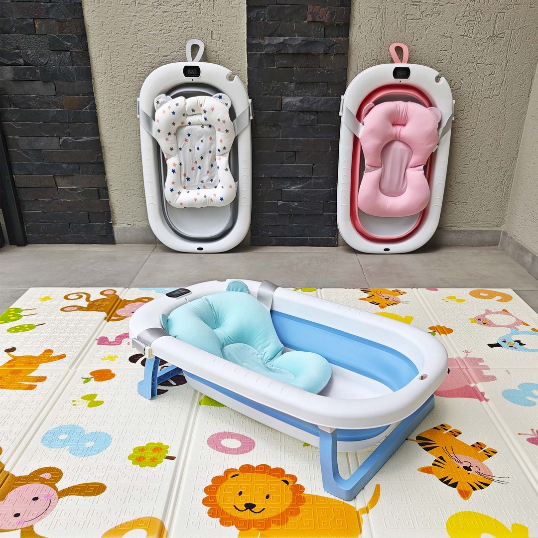 Práctica, segura y cómoda bañera con termómetro mas cojín apta para viajes ya que la puedes guardar de manera fácil, gracias a que es completamente plegable.