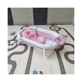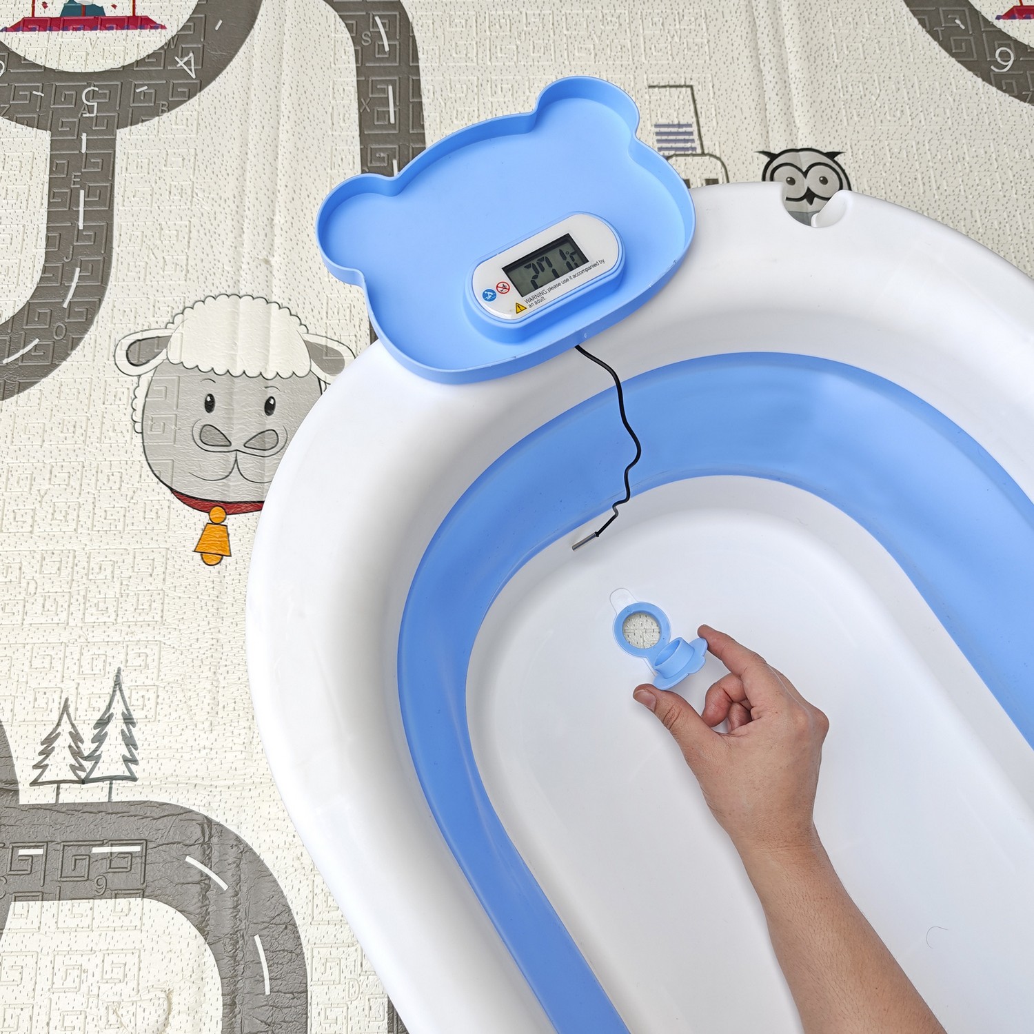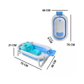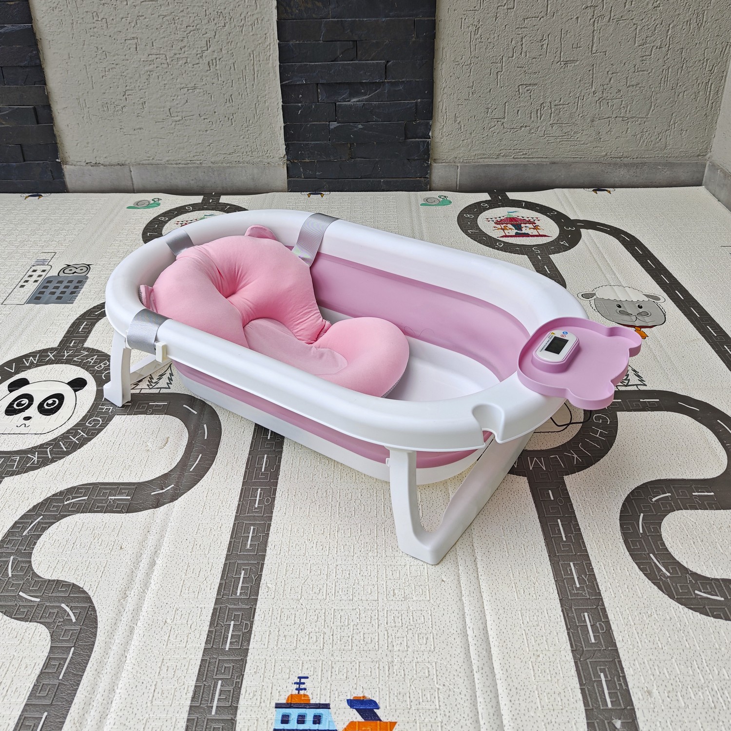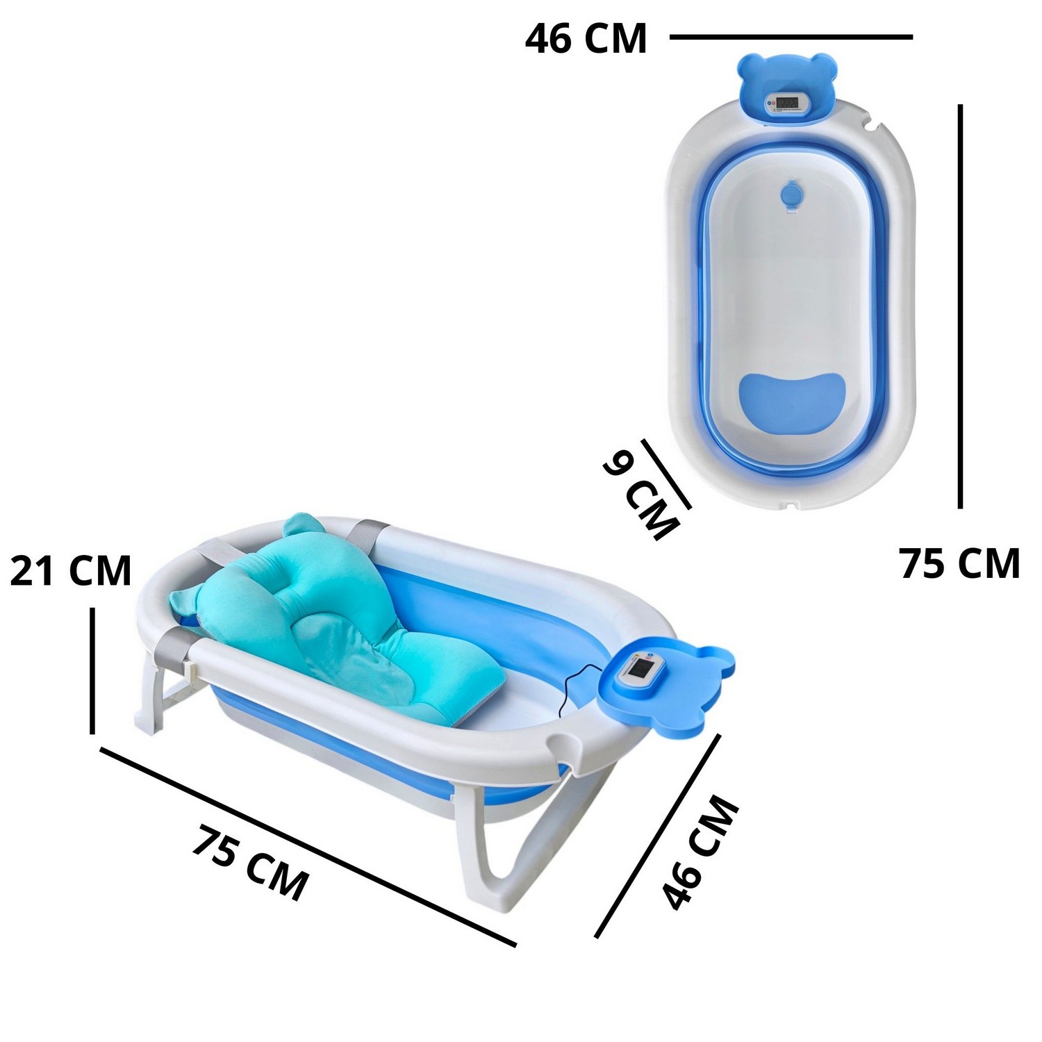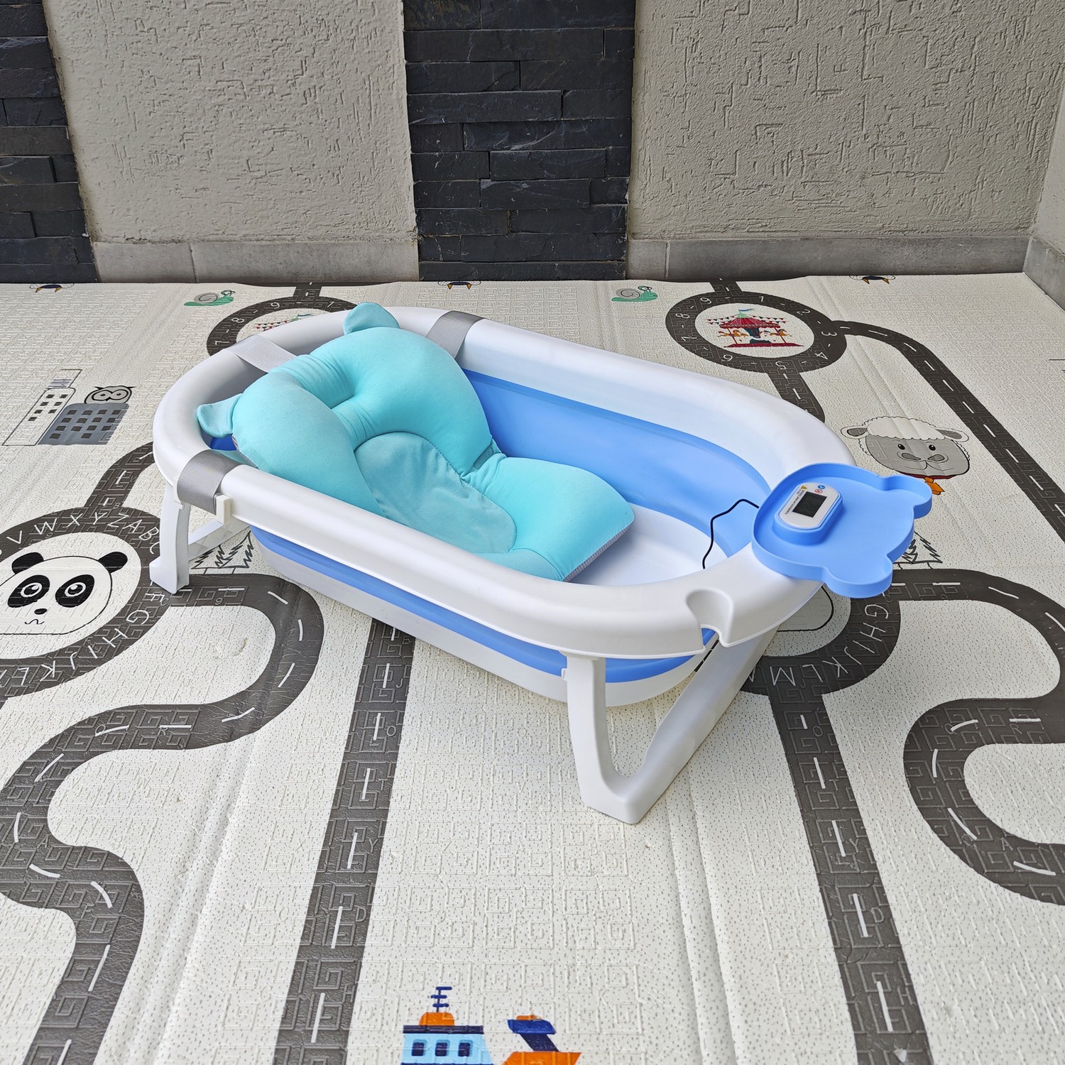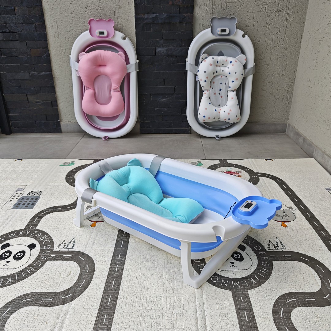 Práctica, segura y cómoda bañera con termómetro mas cojín apta para viajes ya que la puedes guardar de manera fácil, gracias a que es completamente plegable.
